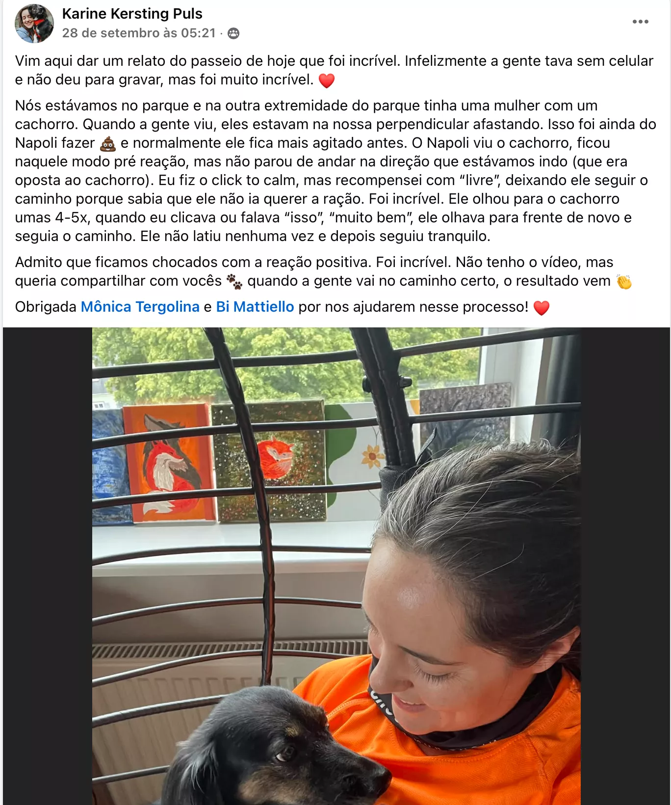 Mônica Tergolina é mãe de 3 cães reativos: Mocki, Bacon e Costelinha. Depois de anos passando perrengue com eles e tendo um passeio caótico, se tornou adestradora e desenvolveu o seu Método Exclusivo, chamado Método Tutora Faixa Preta (o TFP), que conta com mais de 400 alunas em mais de 8 países.
